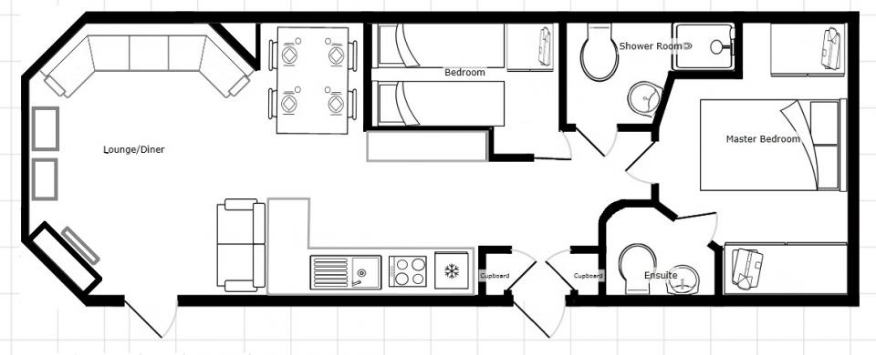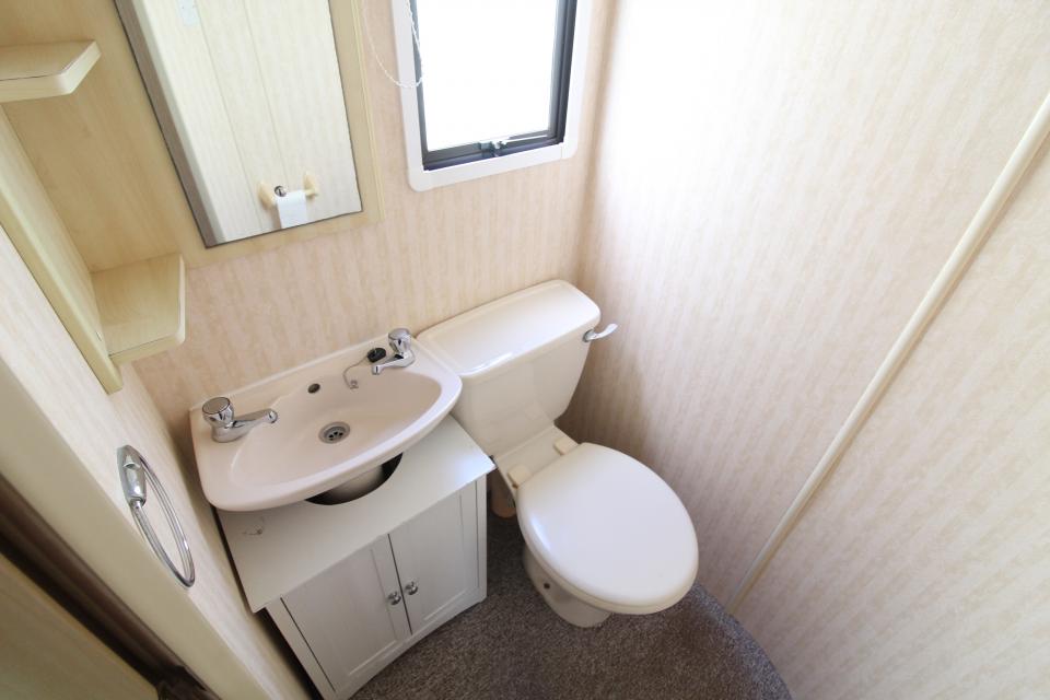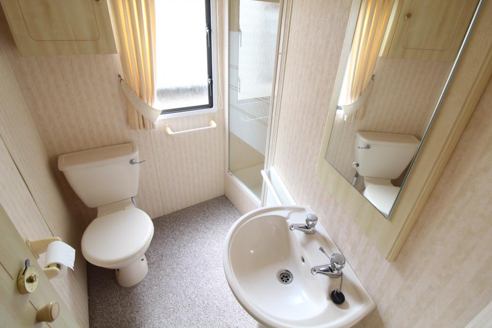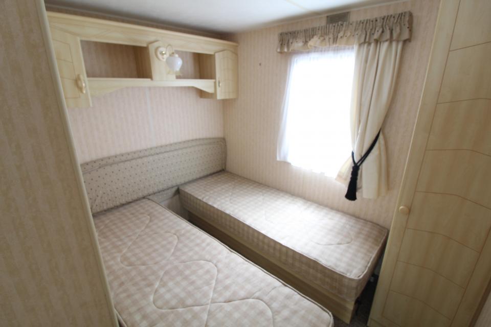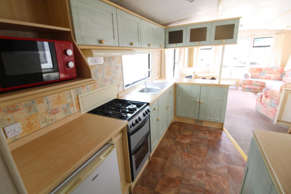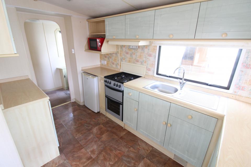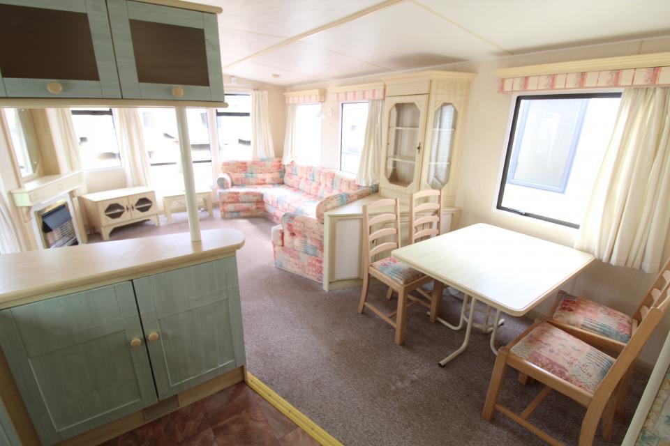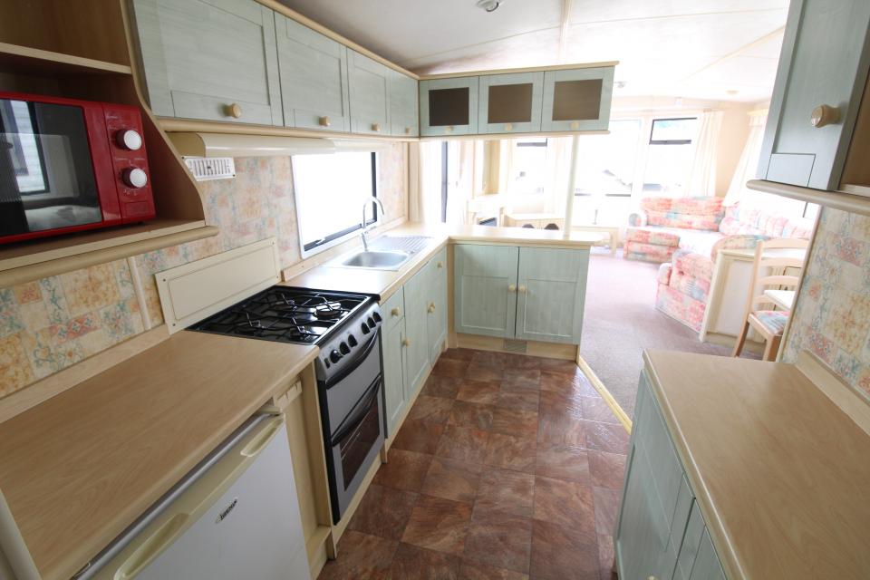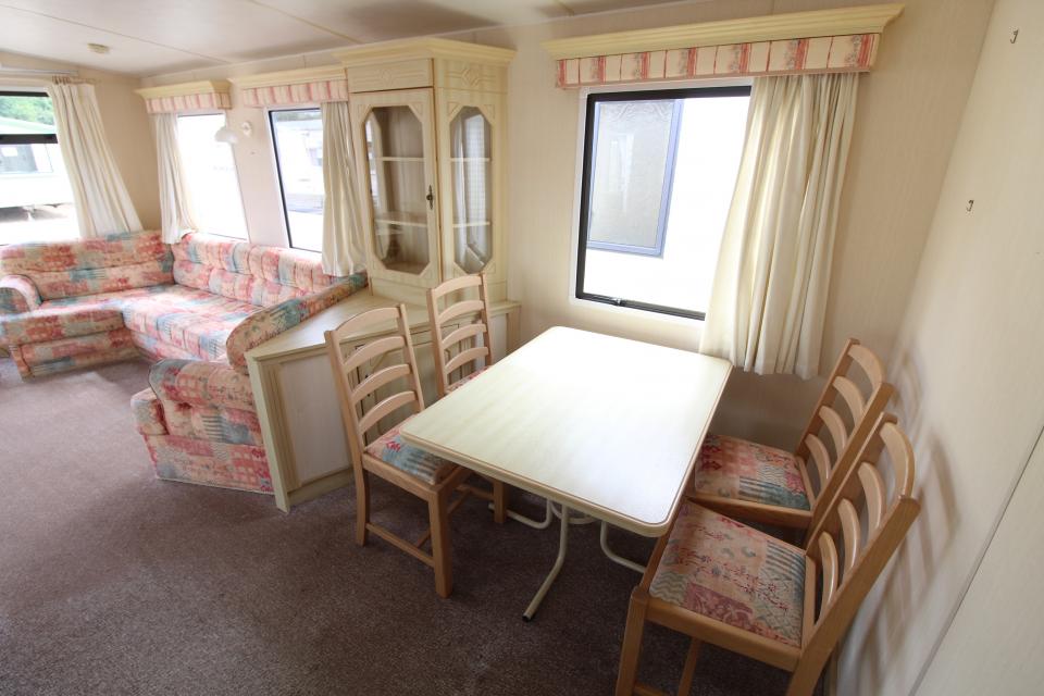 A 12ft wide 2 bedroom caravan. The lounge has fixed seating and an LPG gas fire. The dining area has a free standing table and chairs. Fitted kitchen with an LPG gas cooker. Combined shower room and toilet. One twin bedroom and one double bedroom with an ensuite toilet. A 2001 caravan.