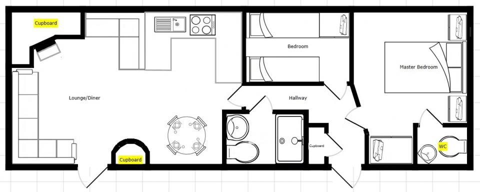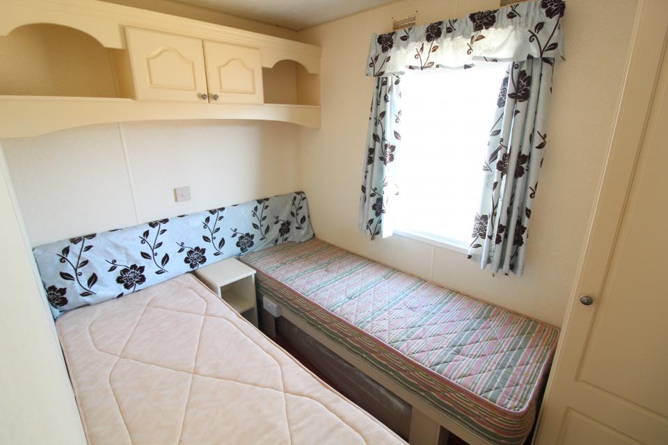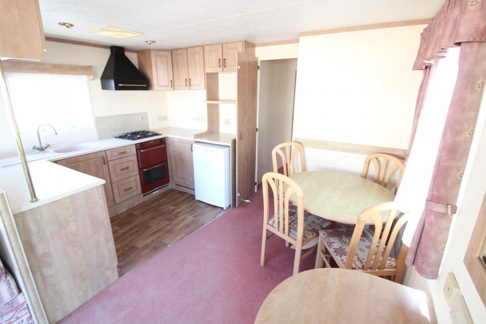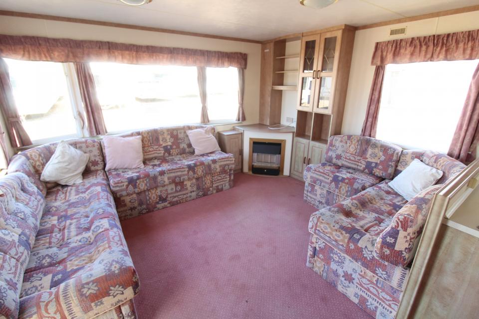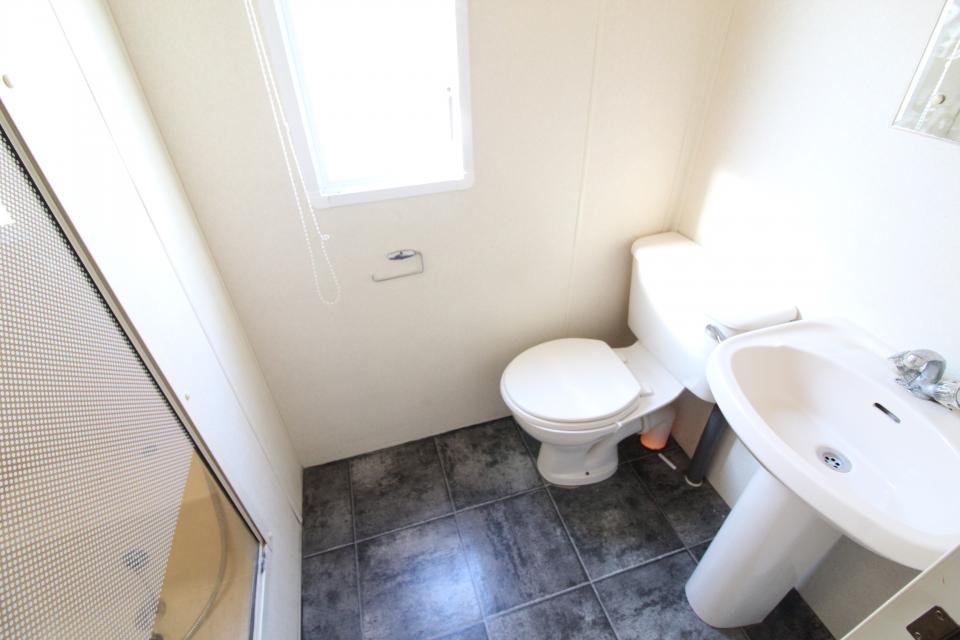A 12ft wide 2 bedroom caravan. The lounge has fixed seating and an LPG gas fire. The dining area has a free standing table and chairs. Fitted kitchen with an LPG gas cooker and hob. The shower room is fitted with a wash basin, toilet and standard shower cubicle. One twin bedroom and one double bedroom with an ensuite toilet. A good 2000 caravan.