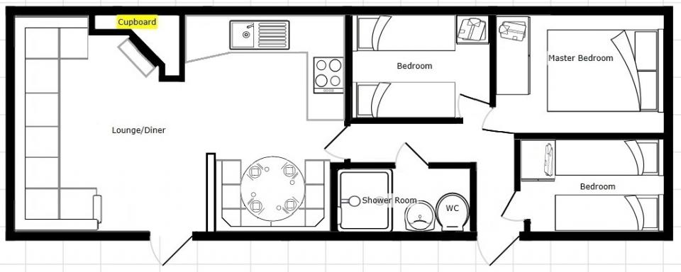 A 12ft wide 3 bedroom caravan. Double Glazed. The lounge has fixed seating and an LPG gas fire. The separate dining area has fixed seating and a free standing table. Fitted kitchen with an LPG gas cooker. Combined shower room and toilet. Additional separate toilet. Two twin bedrooms and one double bedroom. A 2007 caravan.